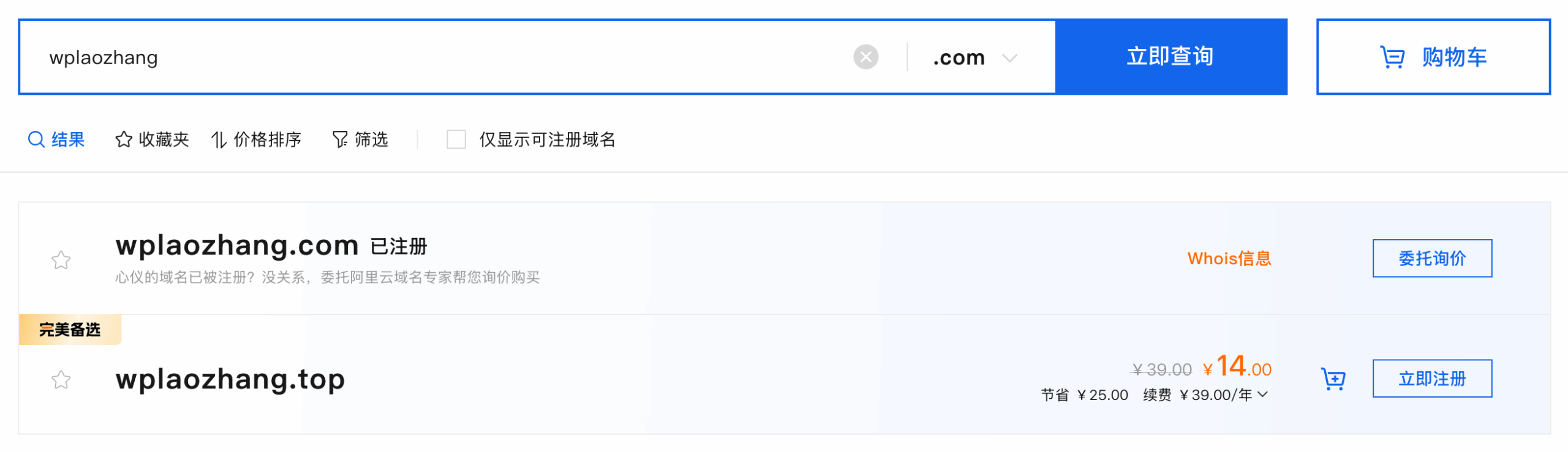 例如 wplaozhang.com 就是一个域名,域名是通过云服务商注册的,价格一般在 100 人民币左右(不同的后缀有差别),先到先得,谁先注册是谁的。
